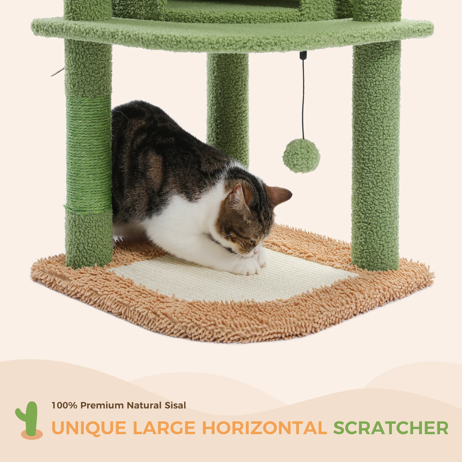 Perfect to Scratch: There are multiple scratchable sections on this cat tower with perch, this cactus cat climbing tree not only has reinforced 3 scratching posts on multiple levels, but also a large scratching pad on the bottom. This design provides one more horizontal area for sharpening nails and having fun